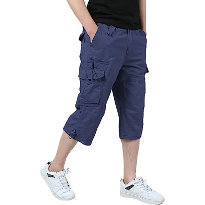 Men's 3/4 Cargo Shorts Elastic Below Knee Capri Long Shorts Casual Loose Fit with 7 Pockets